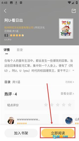 3、在【阿U-看日出】的详情页面,点击底部的【立即阅读】按钮,就能进入这部漫画的阅读界面了。