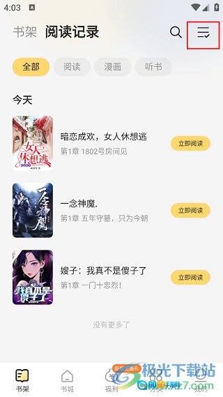 3、进入新界面后,所有阅读记录都能在此找到,随后点击右上角的三条横线图标。