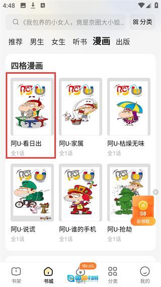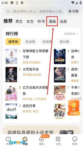 1、进入【书城】页面后,点击顶部的【漫画】分类标签,就能切换到漫画内容的展示界面。