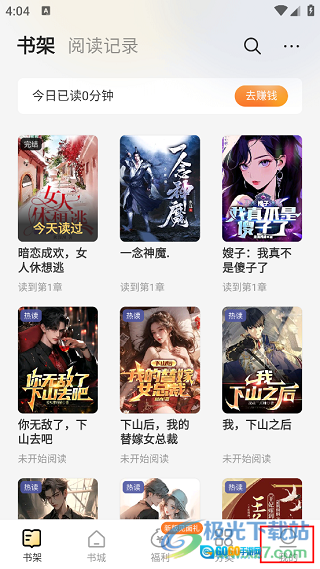 1、打开得间小说极速版进入首页,这里有大量免费小说资源,接着点击页面右下角的“我的”选项。