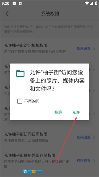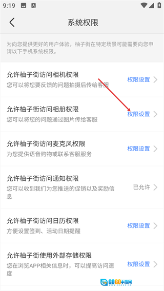 3、找到【允许柚子街访问相册权限】对应的【权限设置】入口并点击。