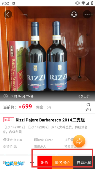 3、进入拍品详情页面后,可点击【出价】按钮参与竞拍,也能选择匿名出价或自动出价的方式。