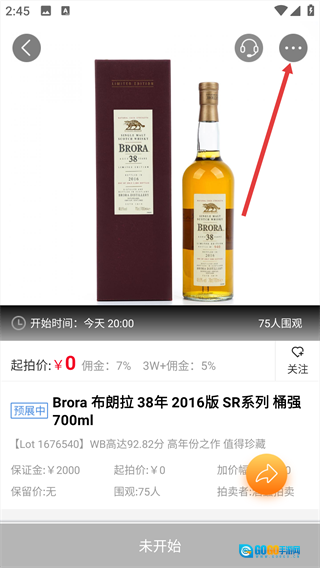 3、进入拍品详情页面后,点击右上角的更多按钮,此时会弹出操作选项栏。