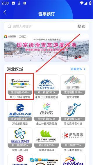 2、在【雪票预订】页面中,选择【河北区域】下的【翠云山银河滑雪场】,进入该雪场的票种页面。