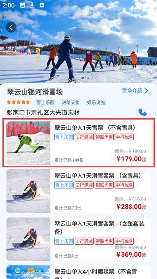 3、在【翠云山银河滑雪场】页面,选择票种,查看其详情信息。