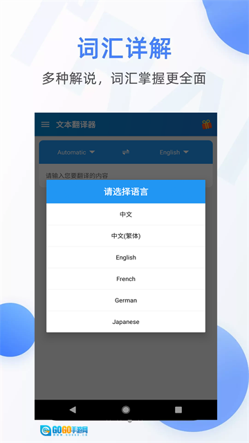 文本翻译器是一款简单实用的翻译工具,无论你是旅行者、学生、商人还是其他语言爱好者,都能轻松使用。它具备丰富多样的功能:首先,支持中文、英语、法语等多种语言的快速翻译,能帮你顺畅与外国人交流,便捷高效;其次,提供详尽的词典解析功能,在线翻译时可查看单词释义,还能一键收藏生成单词本,方便反复背诵;此外,你可以随时查询过往的翻译记录,十分便捷。还有更多实用功能等待探索,感兴趣的话不妨体验一下吧。