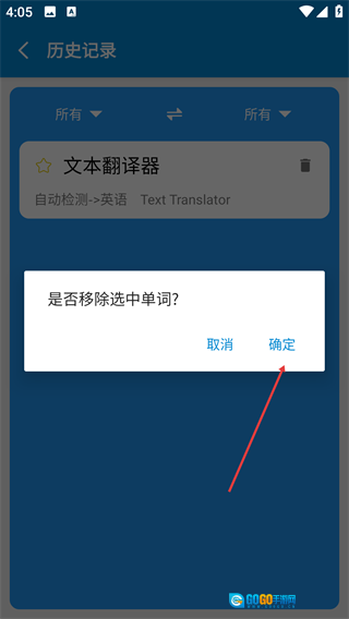 4、在确认提示框里,点击【确定】按钮,即可完成该条翻译历史记录的移除操作。