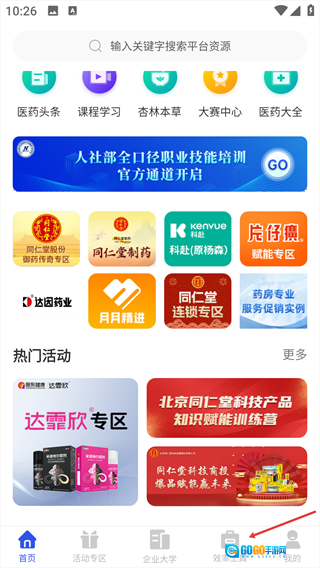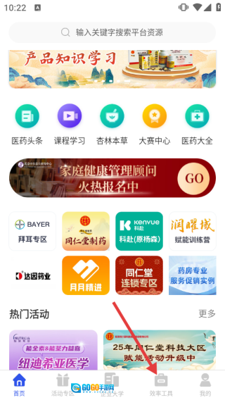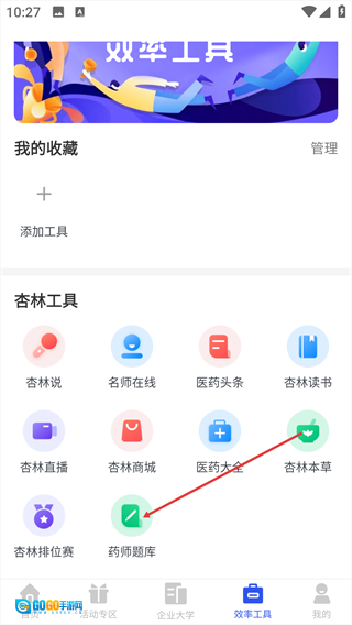2、进入【效率工具】页面后,找到【药师题库】的功能入口。