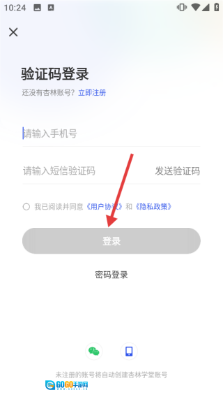 4、在验证码登录页面,输入手机号码,获取并填写验证码,勾选相关协议后点击【登录】按钮,即可完成登录操作。