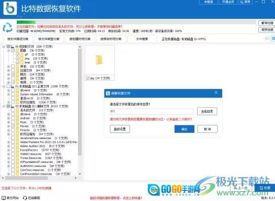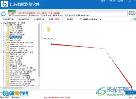 3、进入后选择内存卡内需要备份的重要数据,勾选完成后直接点击右下角的恢复按钮即可。