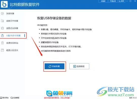 1、把软件的内存卡通过读卡器连接到自己的电脑,接着点击此处的恢复选项,再选择这里的U盘/内存卡恢复功能,最后点击开始按钮即可。