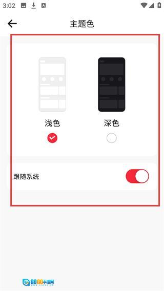 4、在主题色设置页面,你可以选择【浅色】或【深色】模式,也能开启【跟随系统】选项,完成选择后就能切换应用的主题风格了。