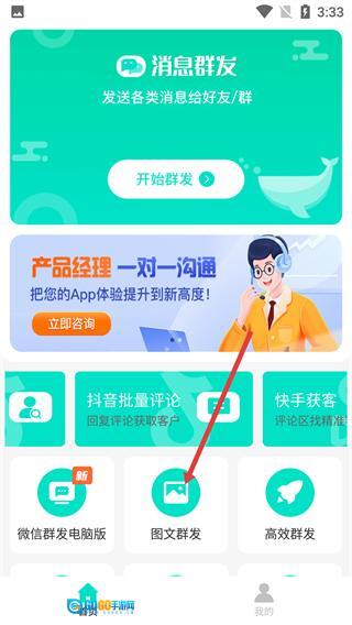 2、进入【消息群发】主界面,找到【图文群发】功能按钮,点击该按钮进入图文群发的编辑页面。