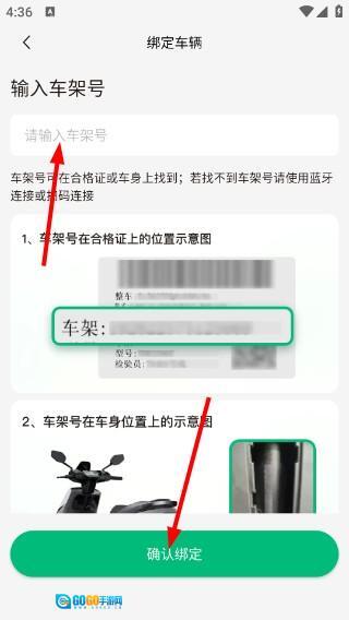 4、选择【手动输入】的绑定方式后,进入对应页面填写【车架号】,可参考示意图找到车架号,之后点击【确认绑定】按钮即可完成操作。