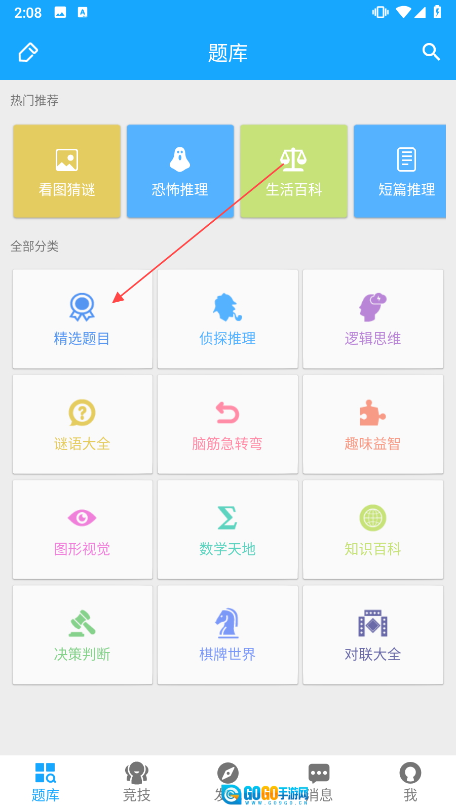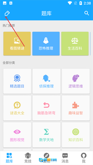 在【题库】页面,你可以按照分类来挑选题目,像精选题目、生活百科这类分类都有,点击进入就能开始答题,以此锻炼自己的知识储备和推理能力。