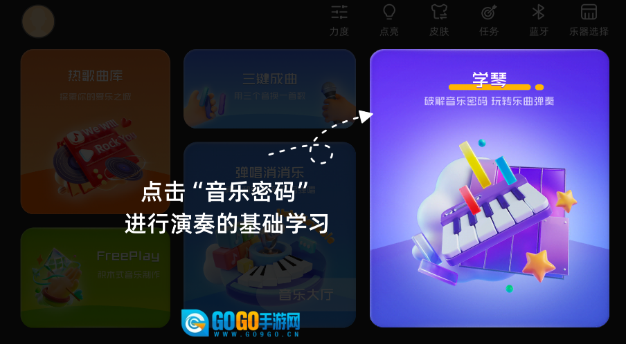 2、根据界面上的引导提示,点击“音乐密码”板块,即可进入基础演奏的教学环节。