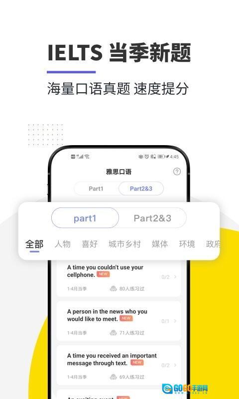 将雅思当季口语新题按场景拆分,每个话题都由经验丰富的教师朗读模板范文,考生既能跟读,也能收听其他考生的口语录音,助力考生通过针对性的场景练习高效提升口语能力。