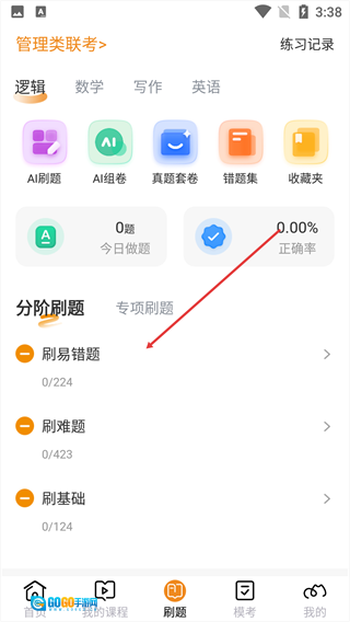 2、在刷题页面的分阶刷题板块里,点击【刷易错题】选项,即可进入相应的答题界面。
