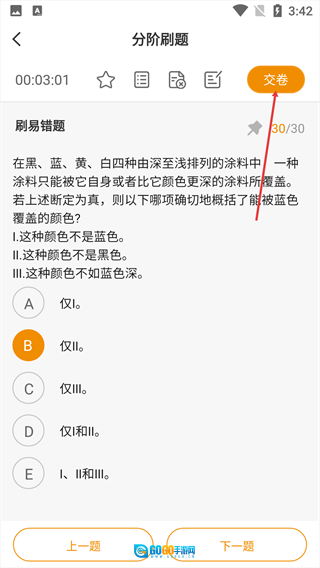 4、在完成本次所有的题目之后,请点击页面右上角的【交卷】按钮,以此提交你的答题结果。
