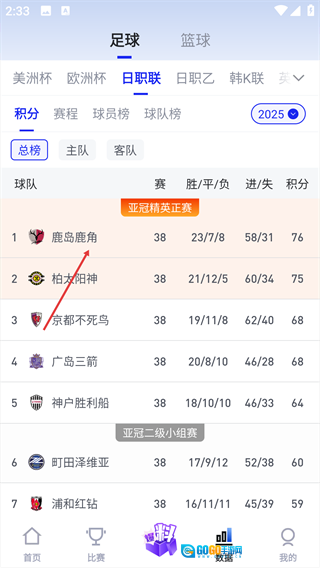 2、选择目标赛事,切换至对应赛事的积分统计界面。