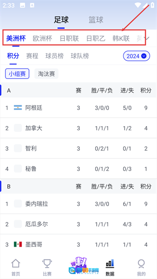 1、点击底部导航栏中的【数据】选项,即可进入赛事数据统计页面。