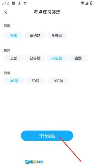 4、在【考点练习筛选】页确认题型、题量等设置后,点击【开始做题】按钮启动该考点的练习。