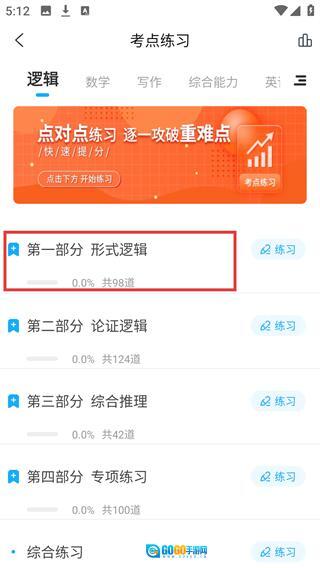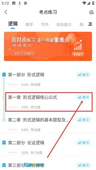 2、进入【考点练习】页后,选择【第一部分-形式逻辑】板块,点击对应区域展开细分考点列表。
