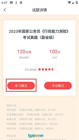 3、进入【试题详情】页,确认考试信息后,选择【练习模式】按钮,进入该真题的练习答题界面。