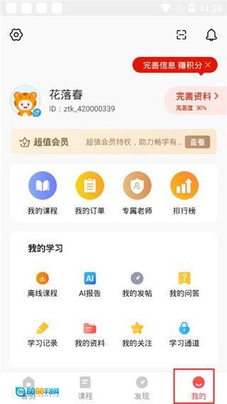 5、点击页面底部的“我的”图标,可访问个人课程、专属教师及排行榜等功能。