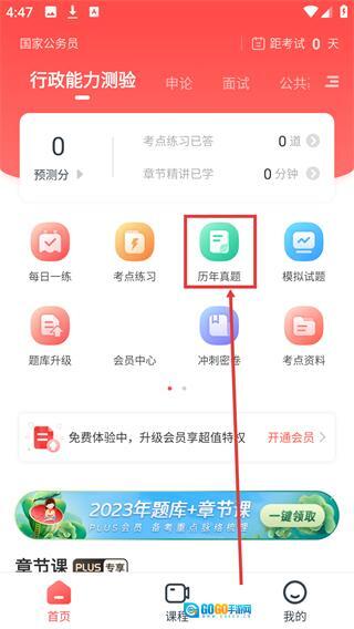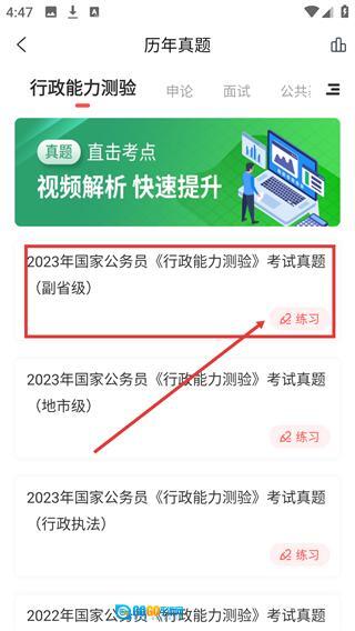 1、在【行政能力测验】页面,找到【历年真题】功能按钮,点击进入历年真题的选择界面。