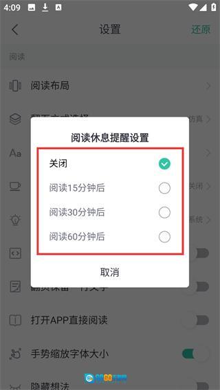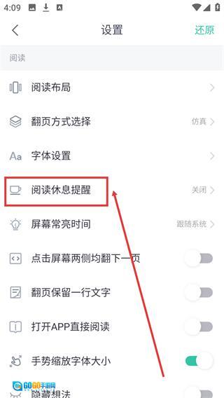 3、进入【设置】页面后,找到【阅读休息提醒】这一选项,点击它就能打开对应的设置弹窗。