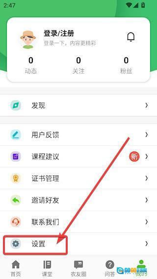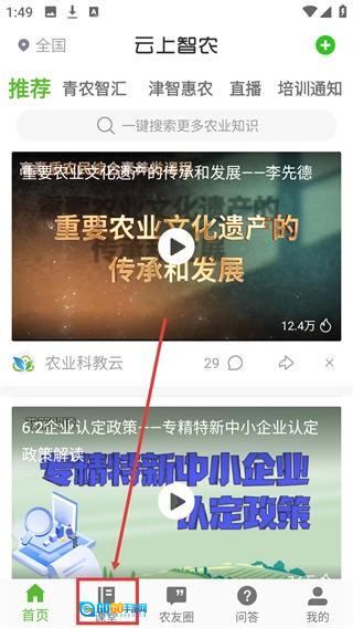 1、打开【云上智农】应用,在界面底部的导航栏中找到标有【课堂】字样的按钮,点击该按钮即可进入与课程相关的页面。