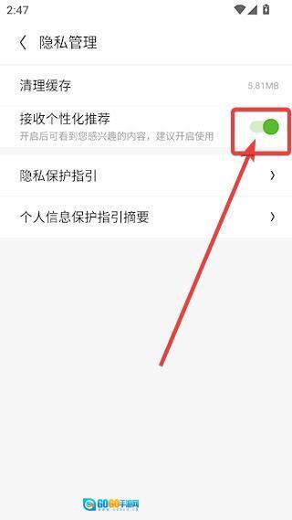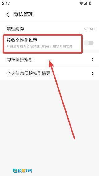 4、点击进入隐私管理,打开【接收个性化推荐】