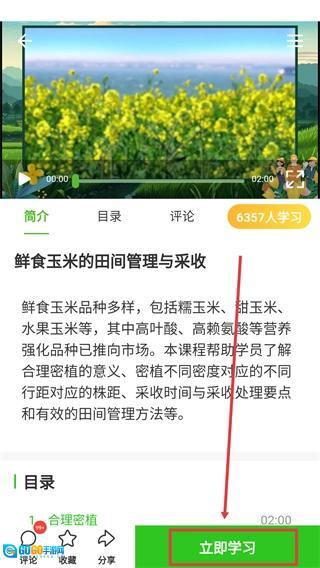 3、点击对应课程进入详情页面,浏览《鲜食玉米的田间管理与采收》的简介内容后,点击页面底部的【立即学习】按钮。