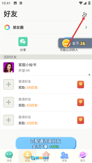 2、在【好友】页面,点击右上角的添加好友按钮。