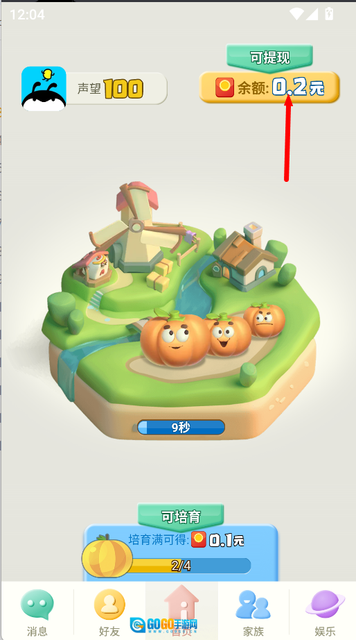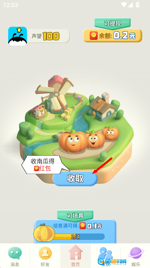 2、等待大约10秒后,系统会自动生成成熟的南瓜,点击它就能领取对应的红包奖励,这些奖励可用于积累收益。