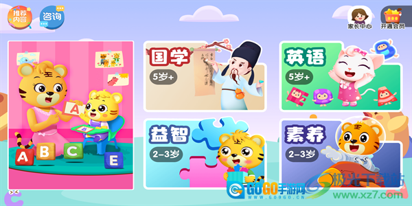 1、点击软件界面后,能看到国学、素养、英语、益智这四种学习类型。
