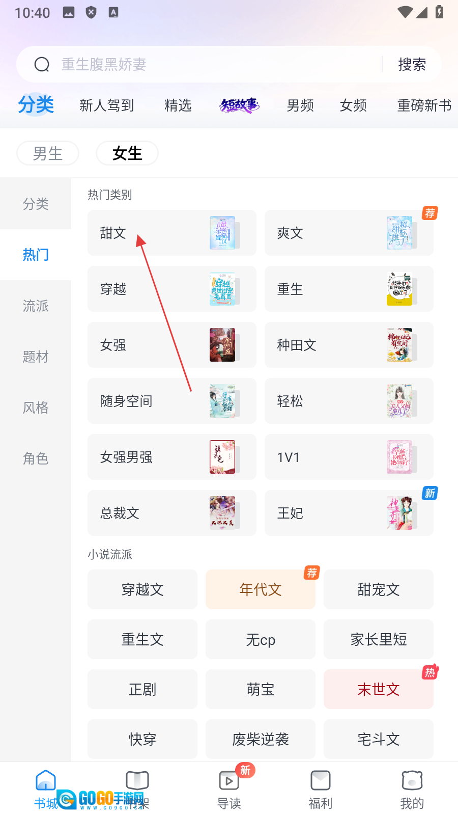 2、在分类页面点击【甜文】选项,即可进入甜文类书籍的列表页面。