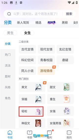 在分类界面选定【女生】分类后,找到并点击【轻松】标签,即可进入对应风格的书籍列表页面。