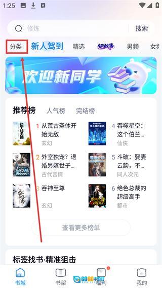 进入书城页面后,点击顶部的【分类】按钮,即可进入书籍分类界面,你可以根据自己的需求筛选书籍类型。