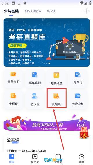 1、进入【题库】页面后,找到并点击【真题班】选项,即可进入课程页面浏览各类题库相关课程。