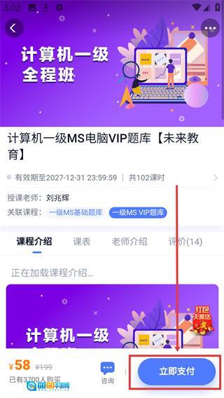 4、进入该课程详情页后,先查看课程相关信息,接着点击页面底部的【立即支付】按钮,就能完成该VIP题库课程的购买流程。