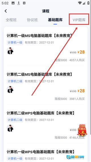 进入课程页面后,找到页面顶部的【VIP题库】标签并点击,就能切换到VIP题库分类页面,查看对应的课程内容。