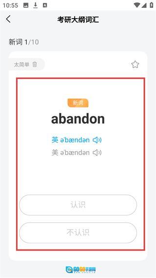 4、进入考研大纲词汇学习页,可查看【abandon】等新词的音标,选择“认识”或“不认识”来推进学习。