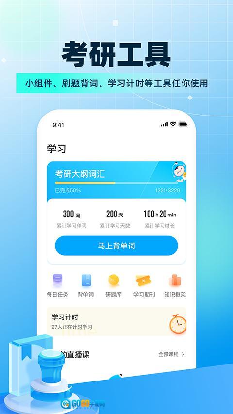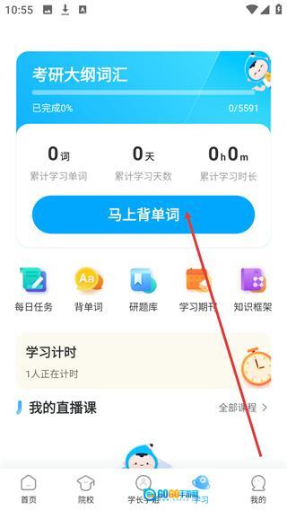 2、进入学习页面后,找到【马上背单词】按钮,点击该按钮可进入背单词页面,开启考研词汇学习。