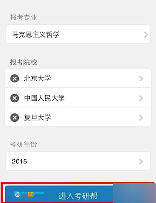 1、点击打开软件,需先完善资料,依次选择“报考专业”“报考院校”“考研年份”,最多可同时选三个报考院校。