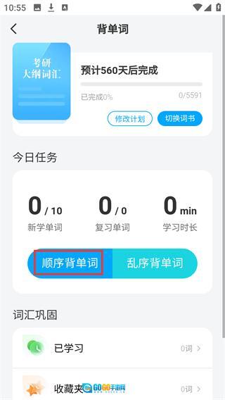 3、在背单词页面中,找到【顺序背单词】选项,点击该选项可按照顺序开始学习考研大纲词汇。
