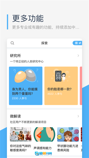 微基因社区是一款引领你探秘生命本质的神奇软件,对自己的独特之处感到好奇时,它能帮你解锁答案,想为未来健康生活提前规划,它是得力参谋,渴望知晓家族的神秘过往。只需轻点屏幕,购买基因检测套件,在家完成简单唾液采集,随后专业实验室便开启解码之旅,约8个工作日,你的专属基因密码便会呈现在眼前,带你领略一个前所未有的“基因世界”。