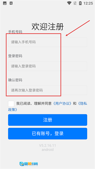4、请按顺序填写【手机号码】、【登录密码】与【确认密码】这三项注册必备的基础信息,从而完成注册流程。