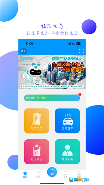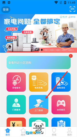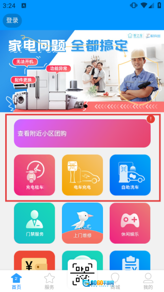 1、打开应用后,在首页点击【查看附近小区团购】即可了解优惠活动;此外,通过【充电桩租车】【电车充电】【自助洗车】【门禁服务】【上门维修】等功能按钮,还能满足各类生活服务需求。